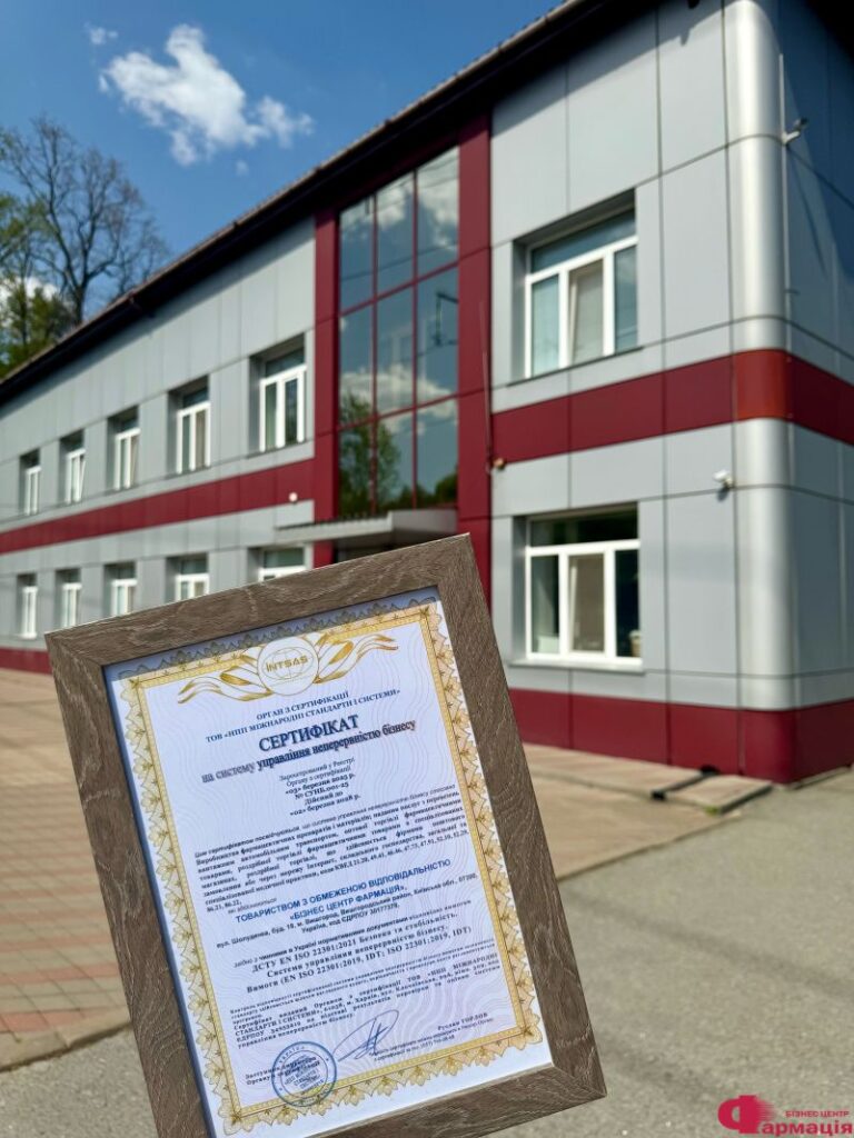 The confirmation of the proper organization of the continuous operation of Business Center Pharmacia LLC was the certification in accordance with DSTU EN ISO 22301:2021 “Safety and Stability. Business Continuity Management Systems. Requirements” (EN ISO 22301:2019, IDT; ISO 22301:2019, IDT).